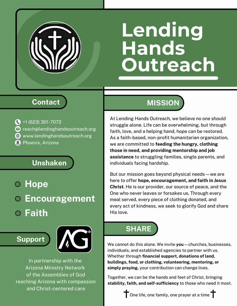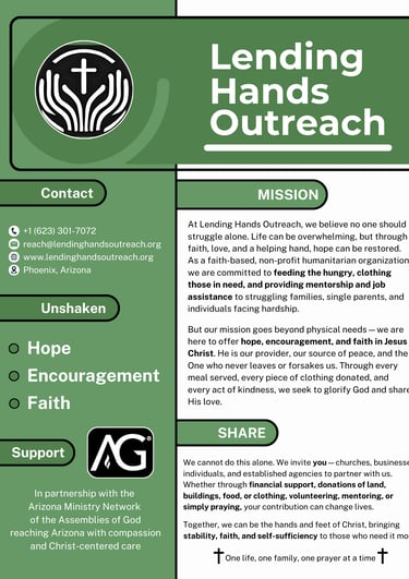 Lending Hands Outreach serves the community, providing support and assistance to those in need through faith-based initiatives and compassionate outreach.